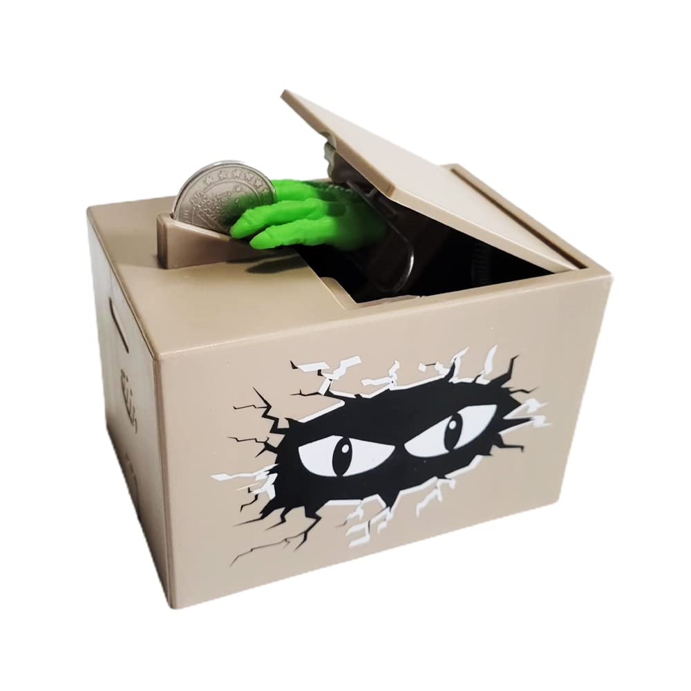 Funny Ghost Hand Money Bank: A ghost hand hiding inside the box and are ready to grab the coin at any time if there is a coin is found by him. In addition, terrible sound effect can be heard when the ghost hand appears.